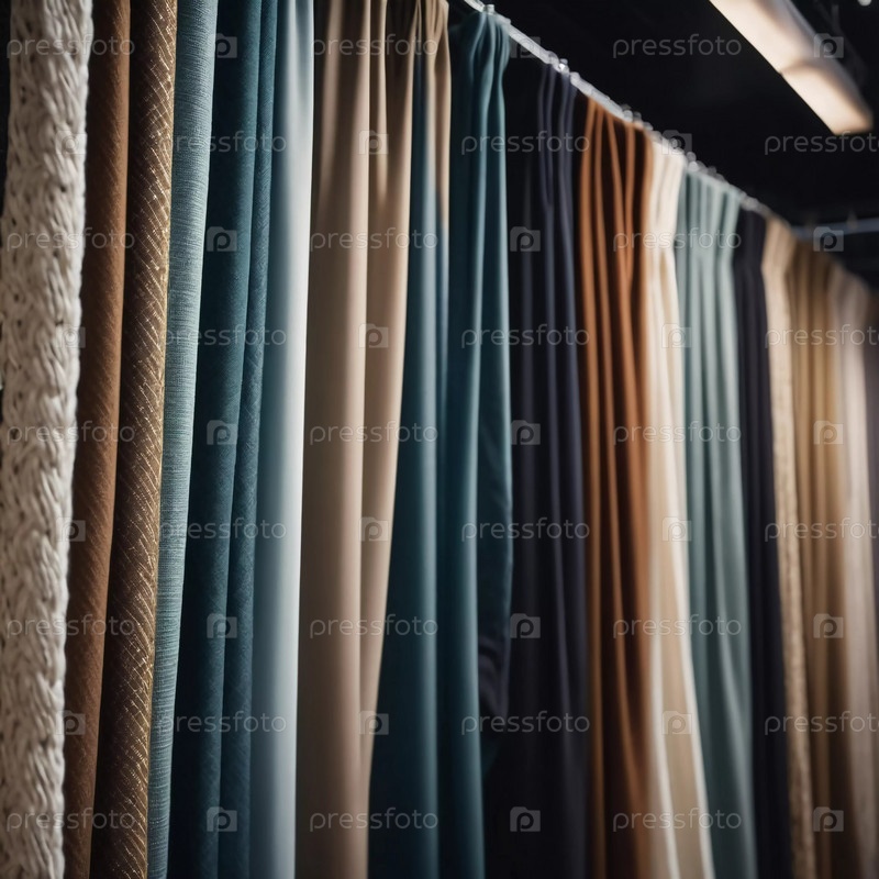 Коллекция штор изящно драпируется, демонстрируя смесь богатых цветов и текстур. Тканевые панели ловят мягкий дневной свет, улучшая приглашающую атмосферу комнаты. Генерирующий ИИ
