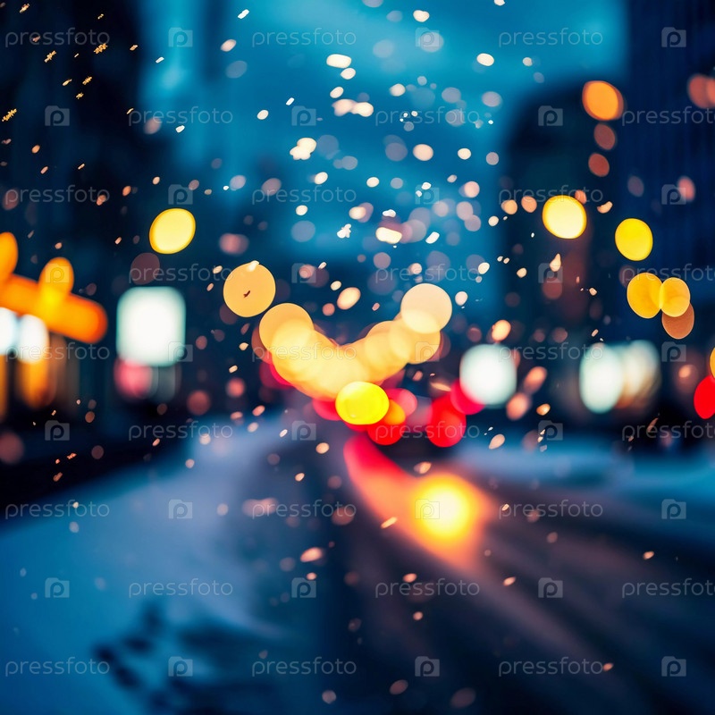 Тихий зимний вечер окутывает городскую улицу, где мягко падающий снег усиливает свечение рождественских огней. Праздничная атмосфера привлекает людей, празднующих Новый год. Генеративный ИИ