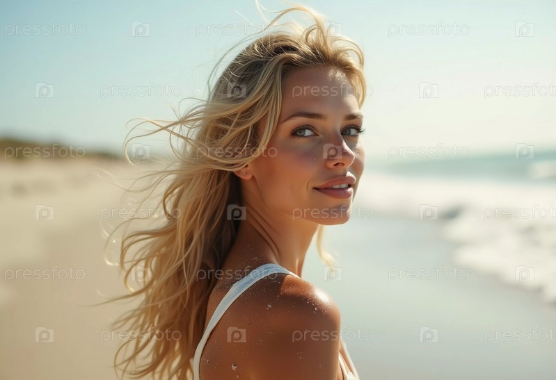 Блондинка в купальнике смотрит назад, стоя у береговой линии. Нежные морские волны лазают у ее ног под ясным голубым небом. Длинные волосы, красивое молодое лицо. Реклама путешествий и одежды. ИИ