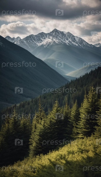 Величественные горы возвышаются над безмятежным еловым лесом под драматическим небом, демонстрируя красоту природы в сумерках. Высокие горы с холмами и угрюмым небом, освещающим мирную пустыню. ИИ