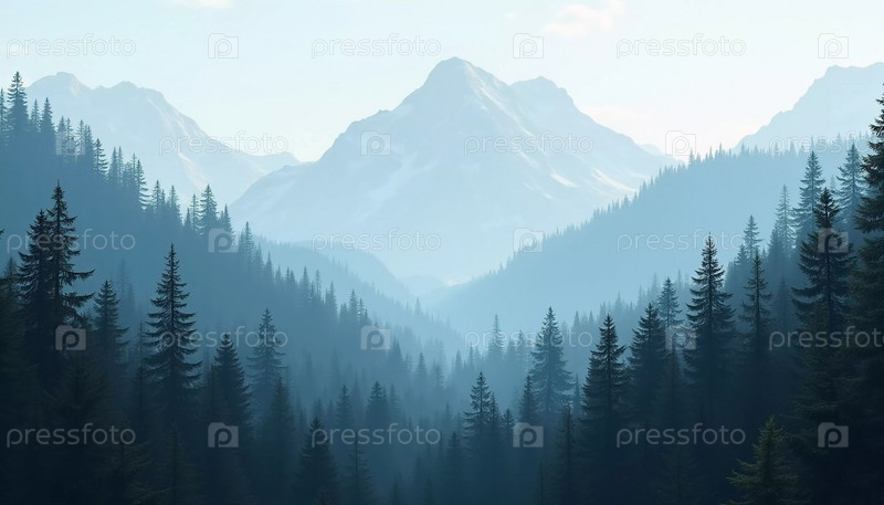 Мирный вид разворачивается с высокими еловыми деревьями, обрамляющими величественные горы, купающиеся в мягком утреннем свете. Пышный зеленый лес спускается в туманную долину, создавая безмятежную атмосферу. Генеративный ИИ