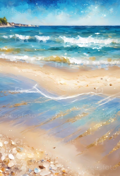 Потрясающий летний фон имеет берег мягкого песчаного пляжа рядом с ярким синим морем. Солнечный свет блестит на поверхности воды, создавая безмятежную атмосферу. Нарисованная картина. Генерирующий ИИ