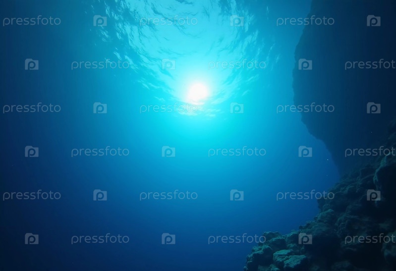 Свет фильтрует поверхность глубокого синего моря, создавая безмятежную атмосферу с яркими лучами, достигающими глубины воды в течение дня. Генерирующий ИИ