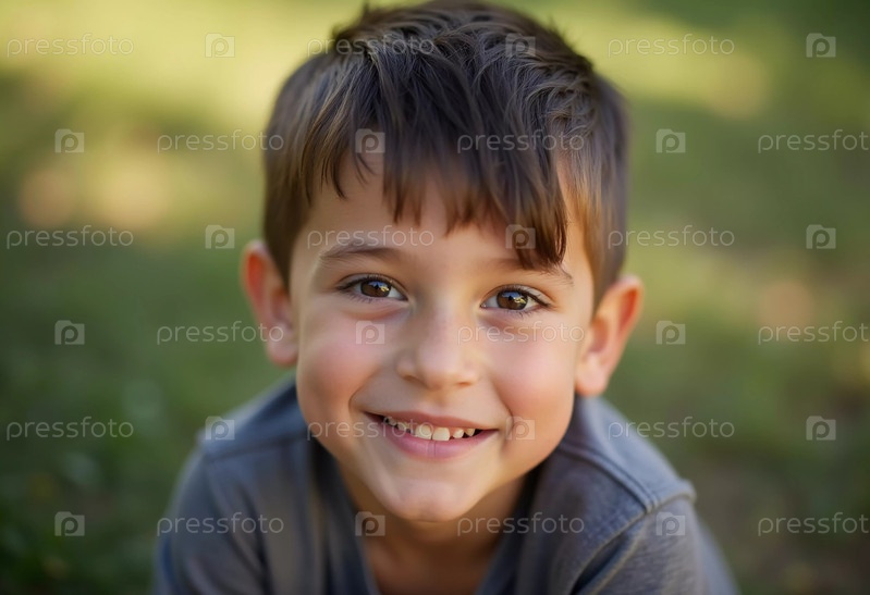 Мальчик 5-10 лет, житель США, носит повседневную одежду. Его яркая улыбка и сверкающие глаза отражают чувство радости и невинности, запечатлев настоящий момент детства. Генерирующий ИИ