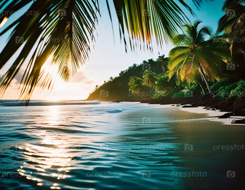 Золотой солнечный свет танцует в спокойных водах пальмового пляжа, выделяя пышную зелень и приглашая волны в этот тропический карибский рай