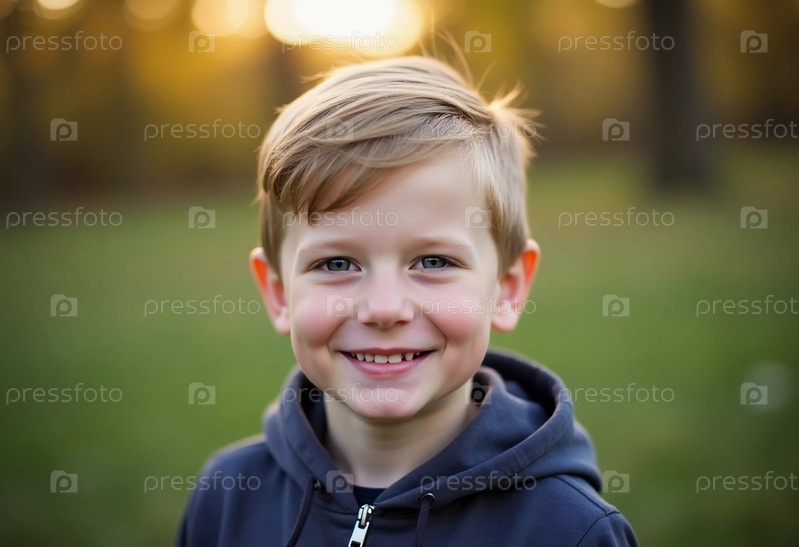 Веселый шведский мальчик со светлыми волосами счастливо блестит в парке, греясь на теплом солнечном свете. Деревья создают красивый фон, поскольку он наслаждается днем, наполненным весельем на открытом воздухе