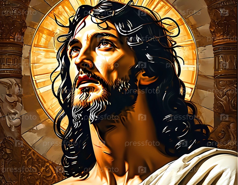 Захватывающее изображение Иисуса Христа, окруженного небесным сиянием, отражающим глубокую мысль и духовность Генеративный ИИ