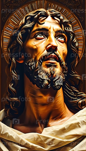 В момент торжественности фигура, напоминающая Иисуса Христа, смотрит вверх, освещенная сияющим ореолом. Выражение передает глубокий мир, захватывая чувство божественной связи Генеративный ИИ