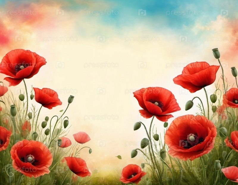 Красные маки, зеленые листья, стебли. Щенки изображены на различных стадиях цветения, причем некоторые полностью открыты, а другие в зародыше. Мягкая спина, создающая нежные романтические чувства. Копируйте пространство. Открытка или макет