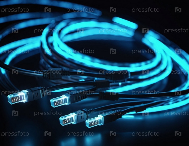 Синие и оранжевые светящиеся провода скручиваются и переплетаются на темном фоне с боке. Черные кабели и разъемы со светящимися огнями и цепями соединяются, чтобы сформировать сеть. генерируемый