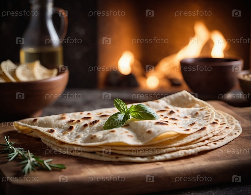 Свежеиспеченный лаваш элегантно опирается на деревенскую деревянную доску, демонстрируя ее мягкую текстуру и золотисто-коричневые пятна. Теплый огонь трещит в очаге, бросая уютное свечение над сценой. Искусственный лепесток