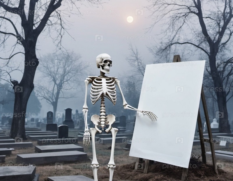 Фигура скелета стоит, держа белый плакат. Костящиеся руки скелета предлагают достаточно места для любого сообщения или дизайна. Скелет что-то предлагает. Тема Хэллоуина. генерируемый