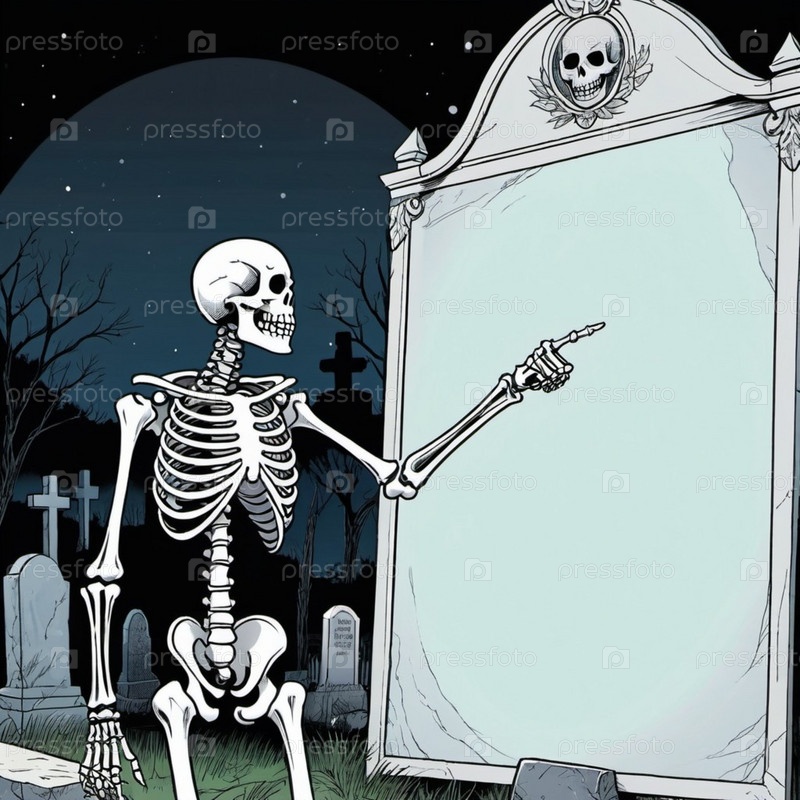 Фигура скелета стоит, держа белый плакат. Костящиеся руки скелета предлагают достаточно места для любого сообщения или дизайна. Скелет что-то предлагает. Тема Хэллоуина. ИИ