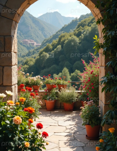 Солнечная терраса, окруженная красочными цветами, приглашает на отдых, предлагая захватывающий вид и уютное место со столовыми стульями. Терраса украшена цветущими цветами и живописными горами. Генеративный ИИ