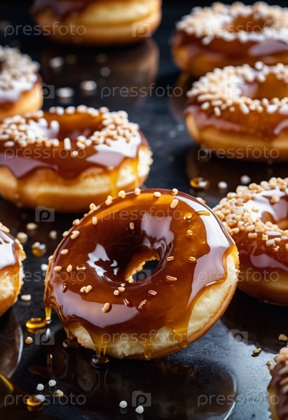 Пачка медовых глазурованных пончиков с глянцевым карамельным покрытием, украшенных хрустящими начинками, приглашая вас побаловать себя сладким угощением. Эти пончики идеально подходят для любого любителя десертов. Генерирующий ИИ