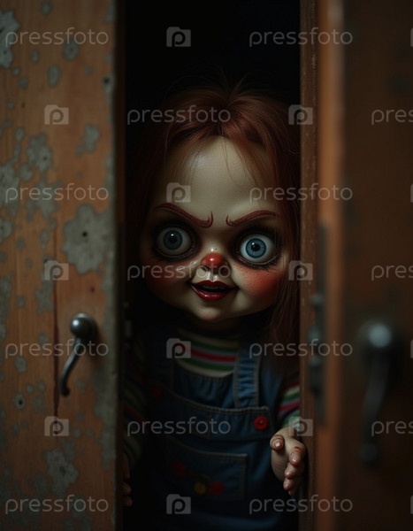 Кукла с пугающими чертами лица выглядывает из шкафа ночью, ее пронзительный взгляд и кривая улыбка создают леденящую атмосферу в тускло освещенной комнате. Страшная кукла для ужаса. Генеративный ИИ
