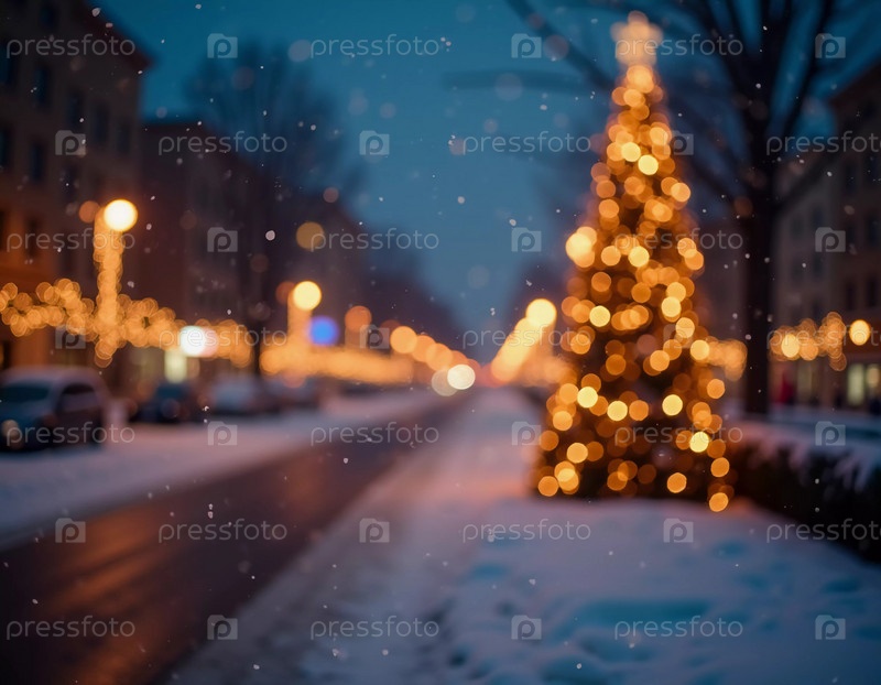 Тихий зимний вечер окутывает городскую улицу, где мягко падающий снег усиливает свечение рождественских огней. Праздничная атмосфера привлекает людей, празднующих Новый год. Генеративный ИИ