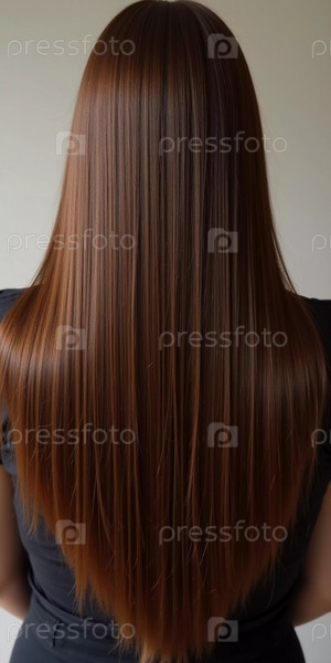 Гладкие, прямые каштановые волосы изящно текут вниз спиной, подчеркивая его здоровый блеск и однородный цвет, освещенный мягким освещением, создавая поразительный вид. Уход за волосами, эффект косметики. ИИ