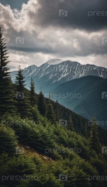 Величественные горы возвышаются над безмятежным еловым лесом под драматическим небом, демонстрируя красоту природы в сумерках. Высокие горы с холмами и угрюмым небом, освещающим мирную пустыню. ИИ