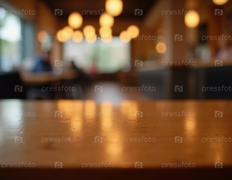 Теплый деревянный стол создает уютную атмосферу в шумном кафе. Мягкие огни освещают фон, где посетители наслаждаются напитками и беседами. Генерирующий ИИ