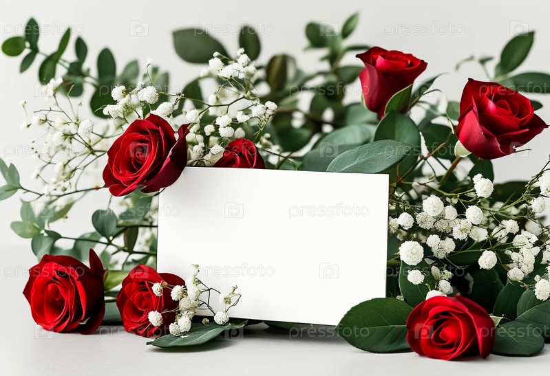 Красивый дисплей имеет яркие красные розы, переплетенные с нежной белой гипсофилой. Пустая карточка сидит среди цветов, приглашая личные заметки для любого торжества