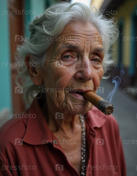Восхитительная пожилая женщина источает очарование, наслаждаясь сигарой на оживленной улице в Гаване, Куба, в окружении ностальгической колониальной архитектуры под теплым солнечным светом