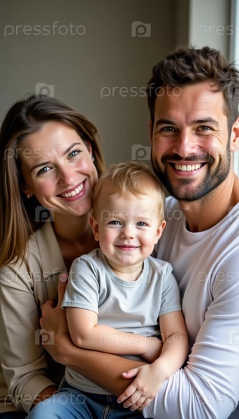 В теплом, привлекательном пространстве мать и отец обнимают своего веселого малыша, захватывая восхитительный момент, наполненный улыбками и привязанностью. Их радость излучается по всей комнате