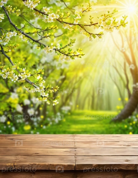Деревянный стол сидит перед размытым фоном весеннего сада. Желтые цветы на ветке достигают солнца, которое светит сквозь листву. Копирование пространства для демонстрации продукции. ИИ