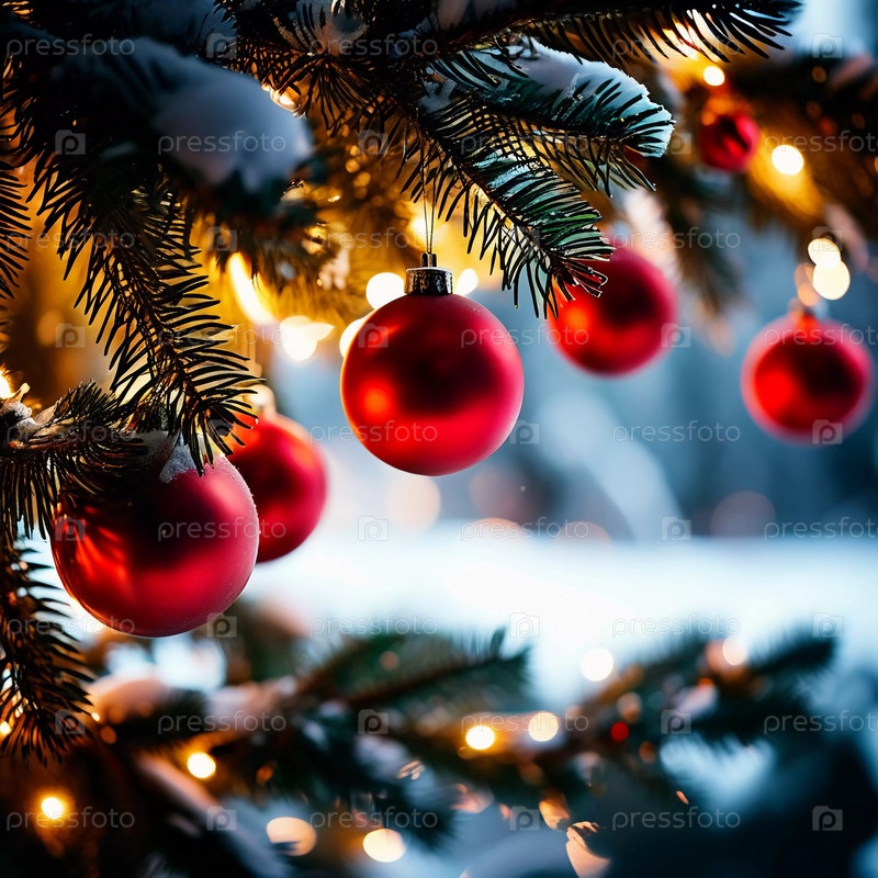 Красочные рождественские украшения украшают ветви елки, яркие шары в оттенках красного и розового, олицетворяющие праздничное настроение зимой. С Новым годом искусство боке фон. Генеративный ИИ