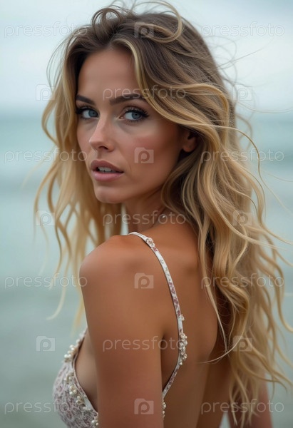 Блондинка в купальнике смотрит назад, стоя у береговой линии. Нежные морские волны лазают у ее ног под ясным голубым небом. Длинные волосы, красивое молодое лицо. Реклама путешествий и одежды. ИИ