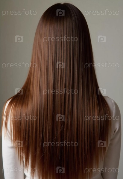 Гладкие, прямые каштановые волосы изящно текут вниз спиной, подчеркивая его здоровый блеск и однородный цвет, освещенный мягким освещением, создавая поразительный вид. Уход за волосами, эффект косметики. ИИ