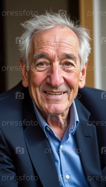 Радостный пожилой мужчина расслабляется в помещении, источая тепло и харизму. Его серебристые волосы дополняют стильный блейзер, создавая привлекательную атмосферу, наполненную мудростью