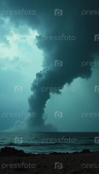 Мощные ветры проносятся по воздуху, поскольку темные облака резко спираль, отмечая приход шторма торнадо над зловещими океанскими водами, создавая леденящую атмосферу Генеративный ИИ