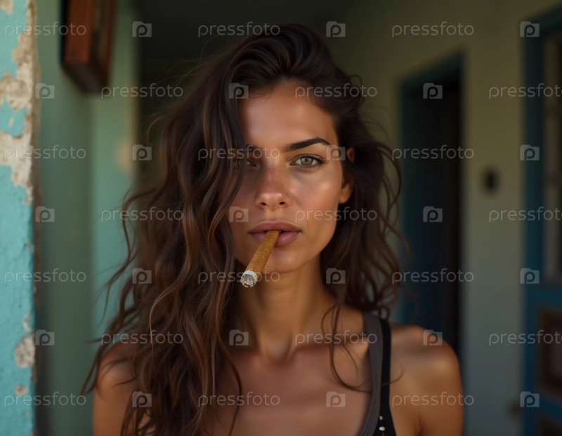 Молодая кубинская женщина уверенно стоит с сигарой, балансируя между губами