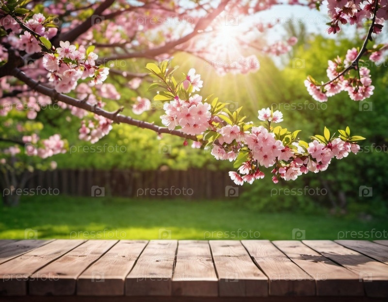 Деревянный стол сидит перед размытым фоном весеннего сада. Розовые цветы сакуры на ветке достигают солнца, которое светит сквозь листву. Копирование пространства для демонстрации продукции. ИИ