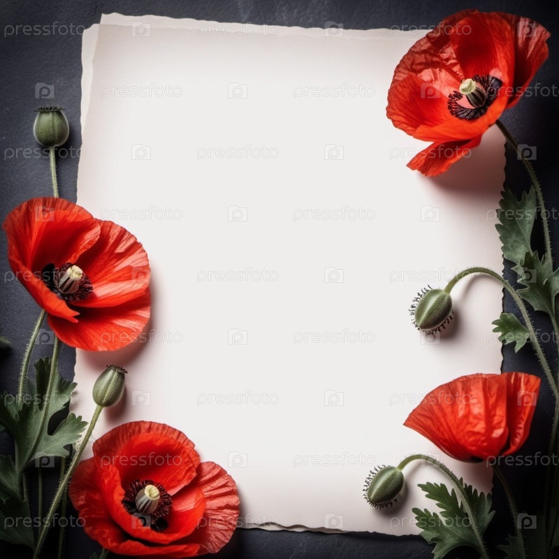 Красные маки с зелеными листьями и стеблями. Маки изображены на различных стадиях цветения, некоторые полностью открыты, а другие в зародыше. Мягкая спина, создающая деликатное и романтическое чувство
