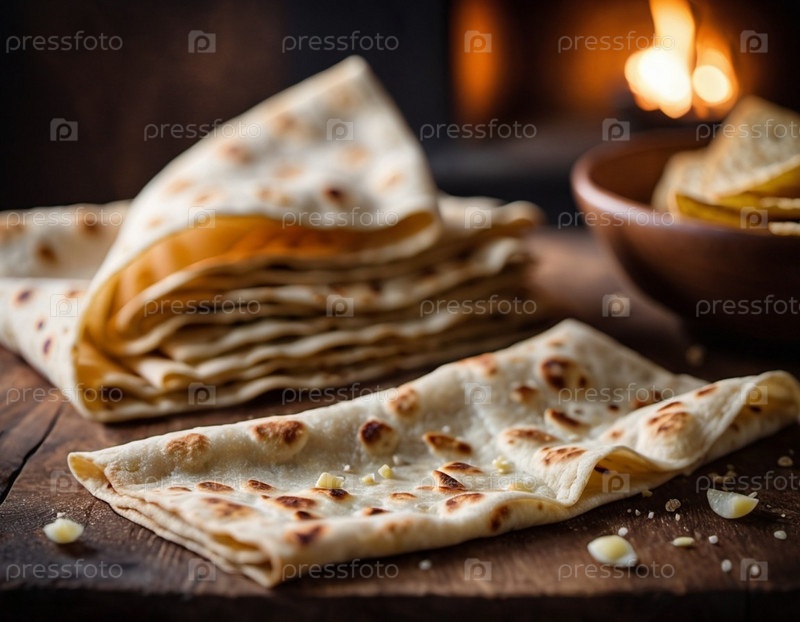 Свежеиспеченный лаваш элегантно опирается на деревенскую деревянную доску, демонстрируя ее мягкую текстуру и золотисто-коричневые пятна. Теплый огонь трещит в очаге, бросая уютное свечение над сценой. Искусственный лепесток