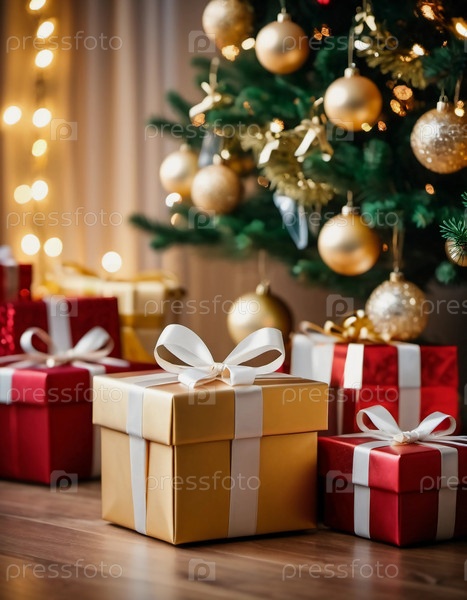 Обернутые в различные цвета подарки сидят под украшенной елкой, украшенной мерцающими рождественскими украшениями, создавая веселую и праздничную атмосферу для празднования Нового года
