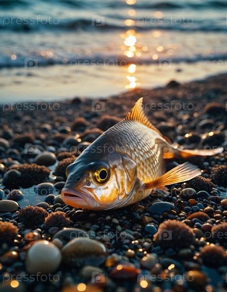 Рыба отдыхает на песчаном пляже, окруженная мелкими камнями и раковинами, в то время как океанские волны тихо ломаются на заднем плане, подчеркивая тревожную проблему снижения морской жизни