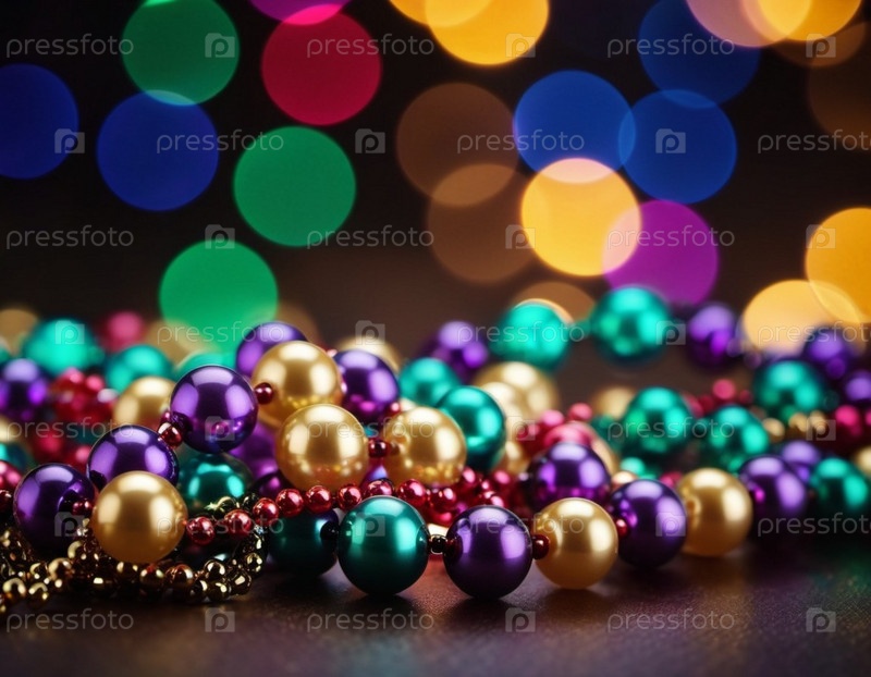 Красочные бусины в фиолетовом, зеленом и золотом создают праздничную атмосферу, когда они лежат на мерцающем фоне боке, воплощая радостный дух праздников Марди Гра в Новом Орлеане