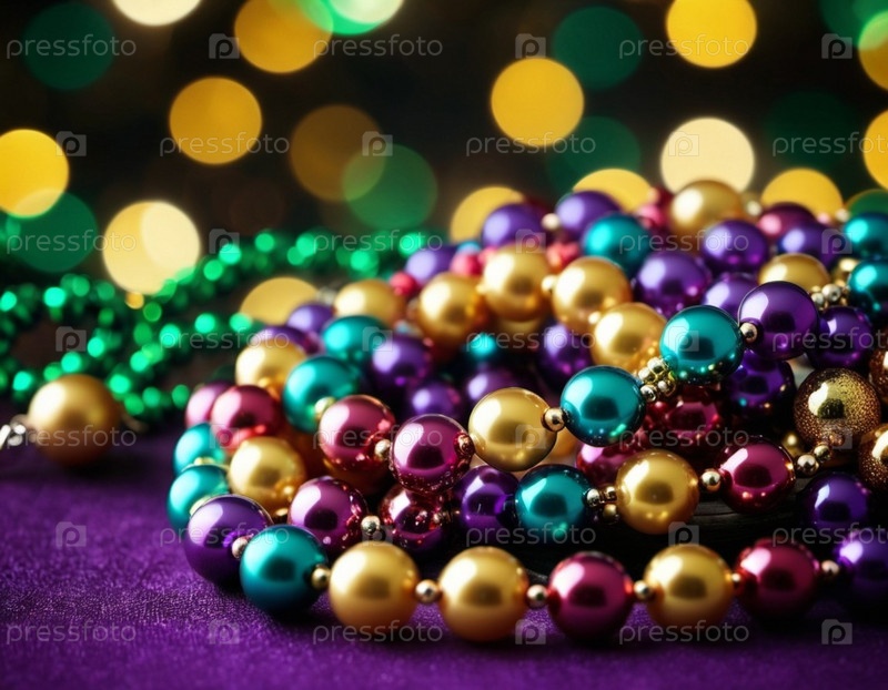Красочные бусины в фиолетовом, зеленом и золотом создают праздничную атмосферу, когда они лежат на мерцающем фоне боке, воплощая радостный дух праздников Марди Гра в Новом Орлеане