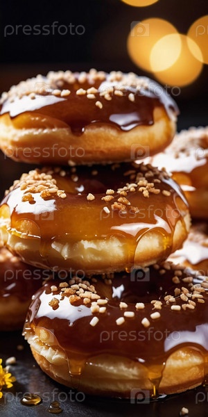 Пачка медовых глазурованных пончиков с глянцевым карамельным покрытием, украшенных хрустящими начинками, приглашая вас побаловать себя сладким угощением. Эти пончики идеально подходят для любого любителя десертов. Генерирующий ИИ