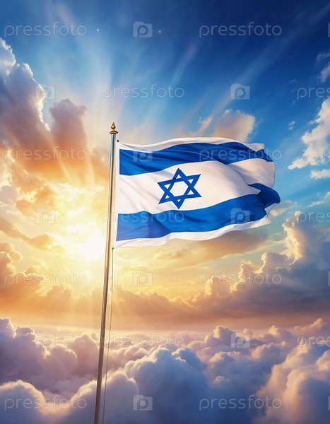 Израильский флаг. Волнуясь на ветру, с синими и белыми полосами и звездой Давида в центре. Чувство движения и энергии. Сгенерированный ИИ
