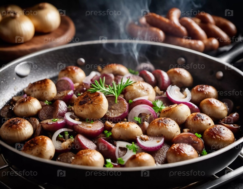 Вкусные жареные грибы в сковороде готовят на средней жаре, испуская пар в уютной обстановке кухни во второй половине дня. Свежесобранные грибы шипят в горячей сковороде, выпуская пар. ИИ