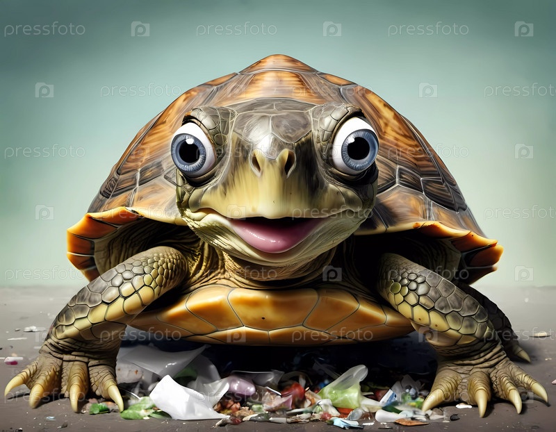 Черепаха любопытно исследует кусок мусора, выглядя удивленной, подчеркивая экологические проблемы в прибрежных местах обитания