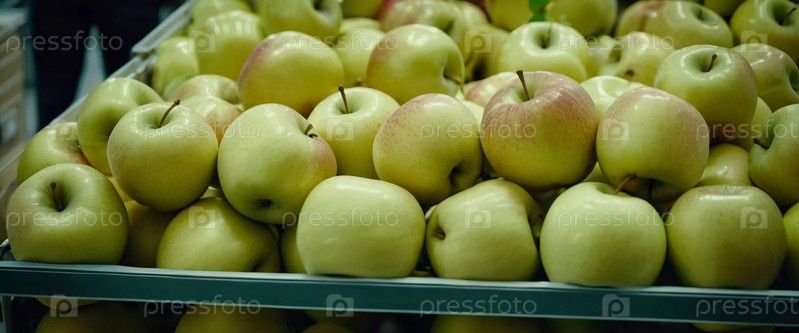Красочный ассортимент желтых яблок аккуратно расположен на прилавке супермаркета, приглашая клиентов исследовать и выбирать свежие фрукты. Генеративный ИИ