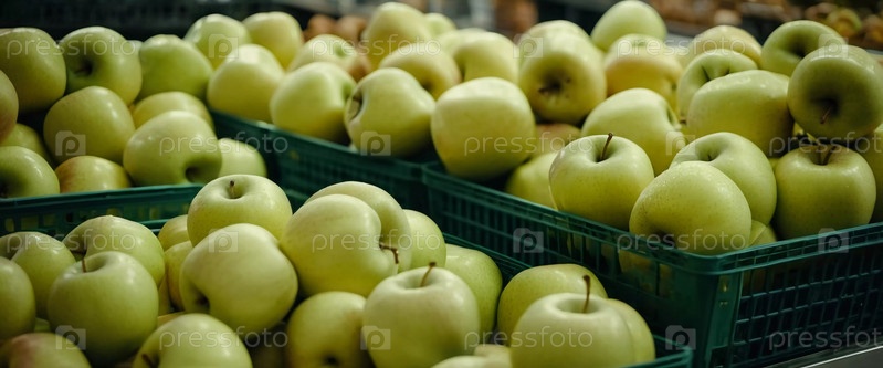 Красочный ассортимент желтых яблок аккуратно расположен на прилавке супермаркета, приглашая клиентов исследовать и выбирать свежие фрукты. Генеративный ИИ