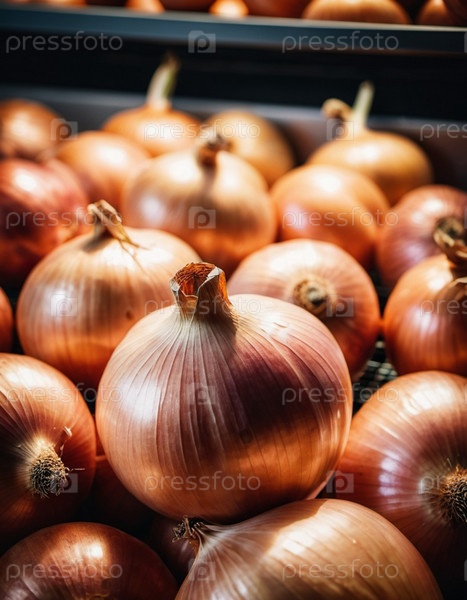 Разнообразие свежего, большого лука аккуратно устроено на прилавке супермаркета, демонстрируя их блестящую, коричневую кожу и приглашая покупателей выбрать их для приготовления пищи. Генеративный ИИ