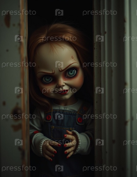 Кукла с пугающими чертами лица выглядывает из шкафа ночью, ее пронзительный взгляд и кривая улыбка создают леденящую атмосферу в тускло освещенной комнате. Страшная кукла для ужаса. Генеративный ИИ