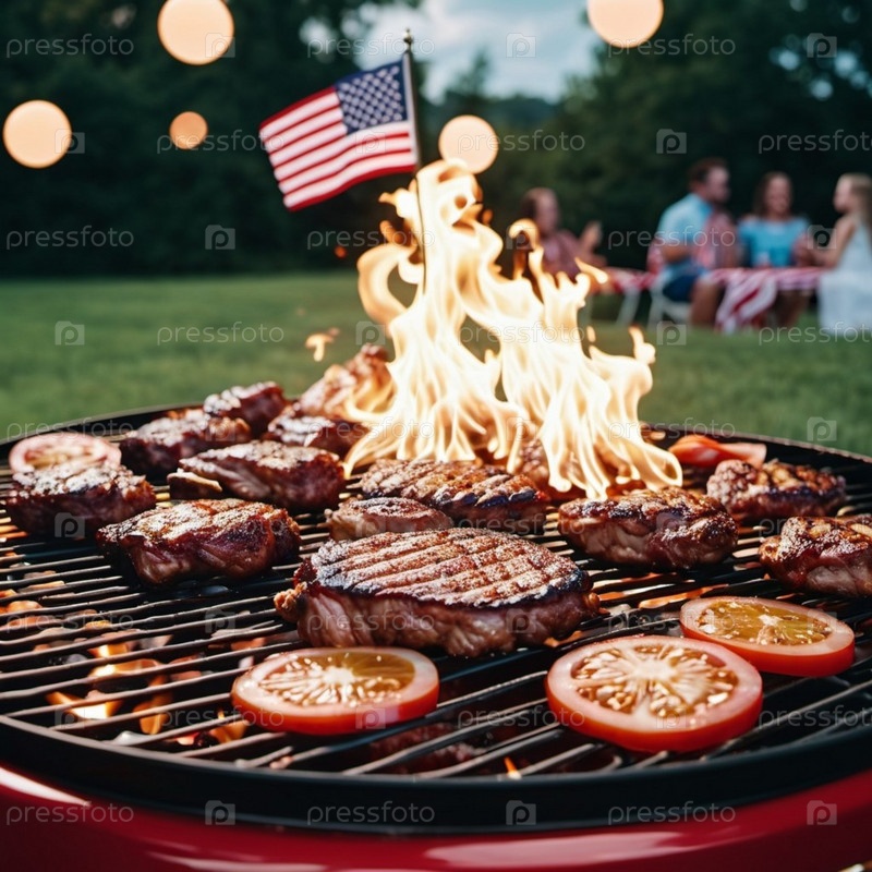 Друзья собираются на оживленное июльское барбекю, жарят аппетитные стейки и свежие помидоры на ярком гриле. Праздничная атмосфера с декоративными огнями усиливает празднование. Генеративный ИИ